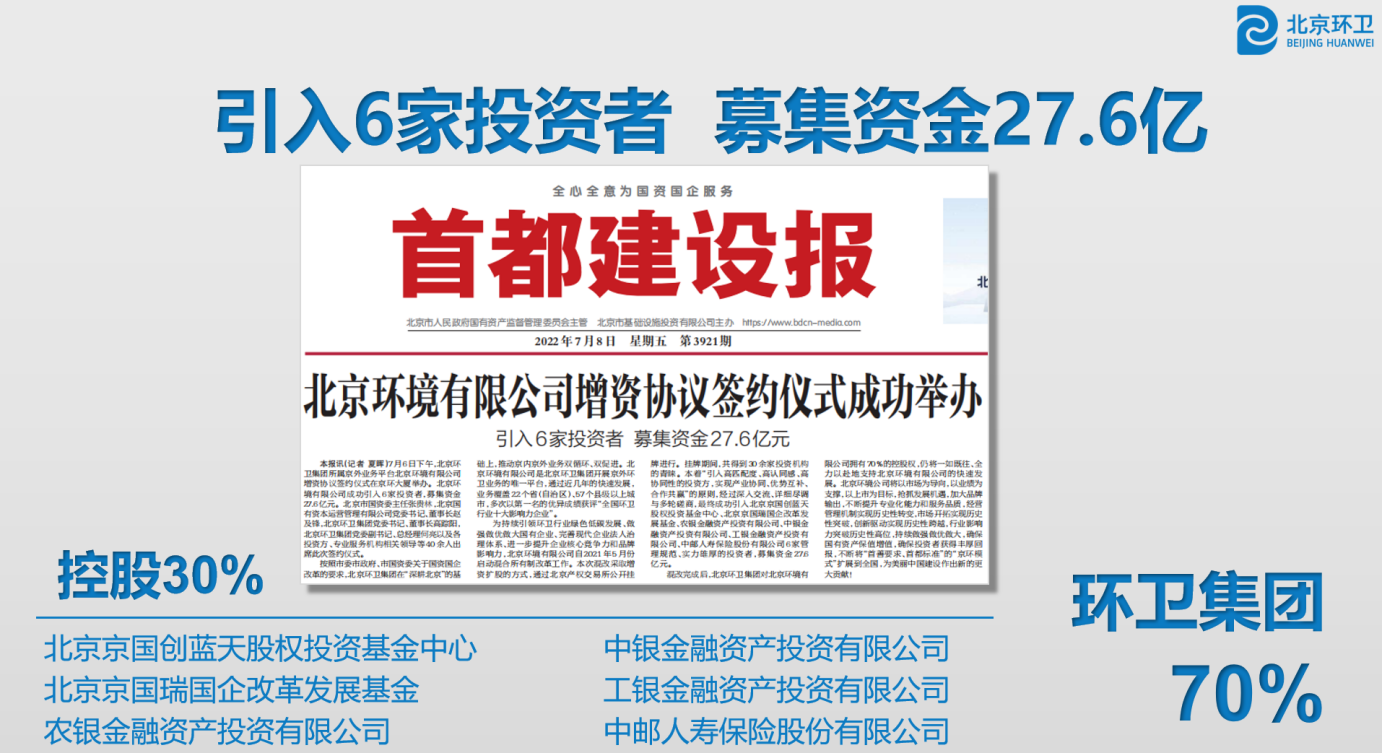 北KY开元境有限公司作为京外环卫业务唯一平台,业务已覆盖21个省(自治区)、46个县级以上城市,所属项目共计147个,公共空间清洁业务面积共计6.79亿平方米,固废收运业务总量679.17万吨,固废处理业务总量329.19万吨,为属地提供高品质环卫服务。2022年成功引入北京京国创蓝天股权投资基金中心等6家高匹配度、高认同感、高协同性的投资方,募集资金27.6亿元,实现产业协同、优势互补、合作共赢,进一步提升企业经营活力、市场影响力和核心竞争力。