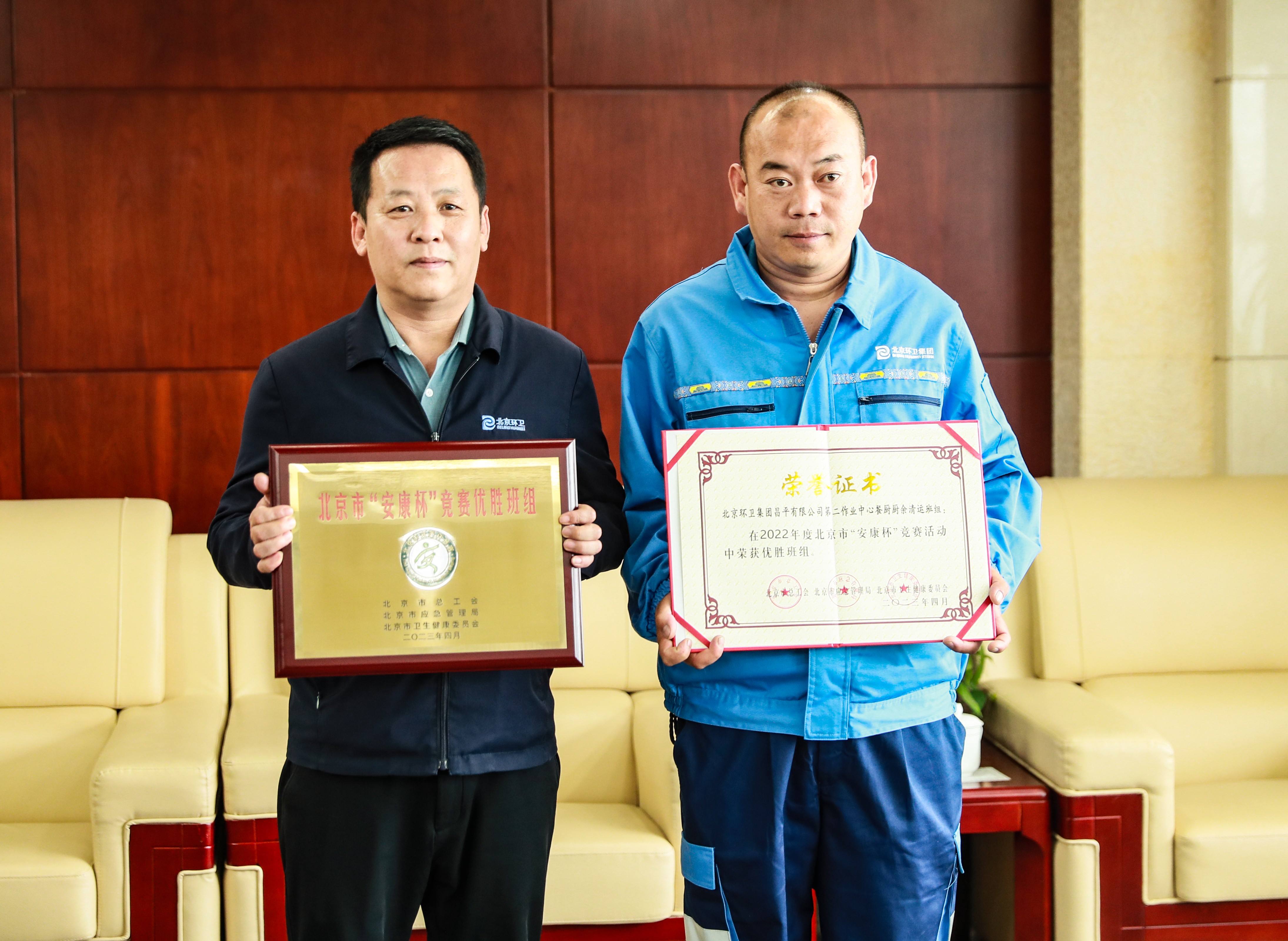 领奖代表:昌平公司第二作业中心副经理董云涛(左);昌平公司第二作业中心餐厨厨余清运班班长杨建军(右)