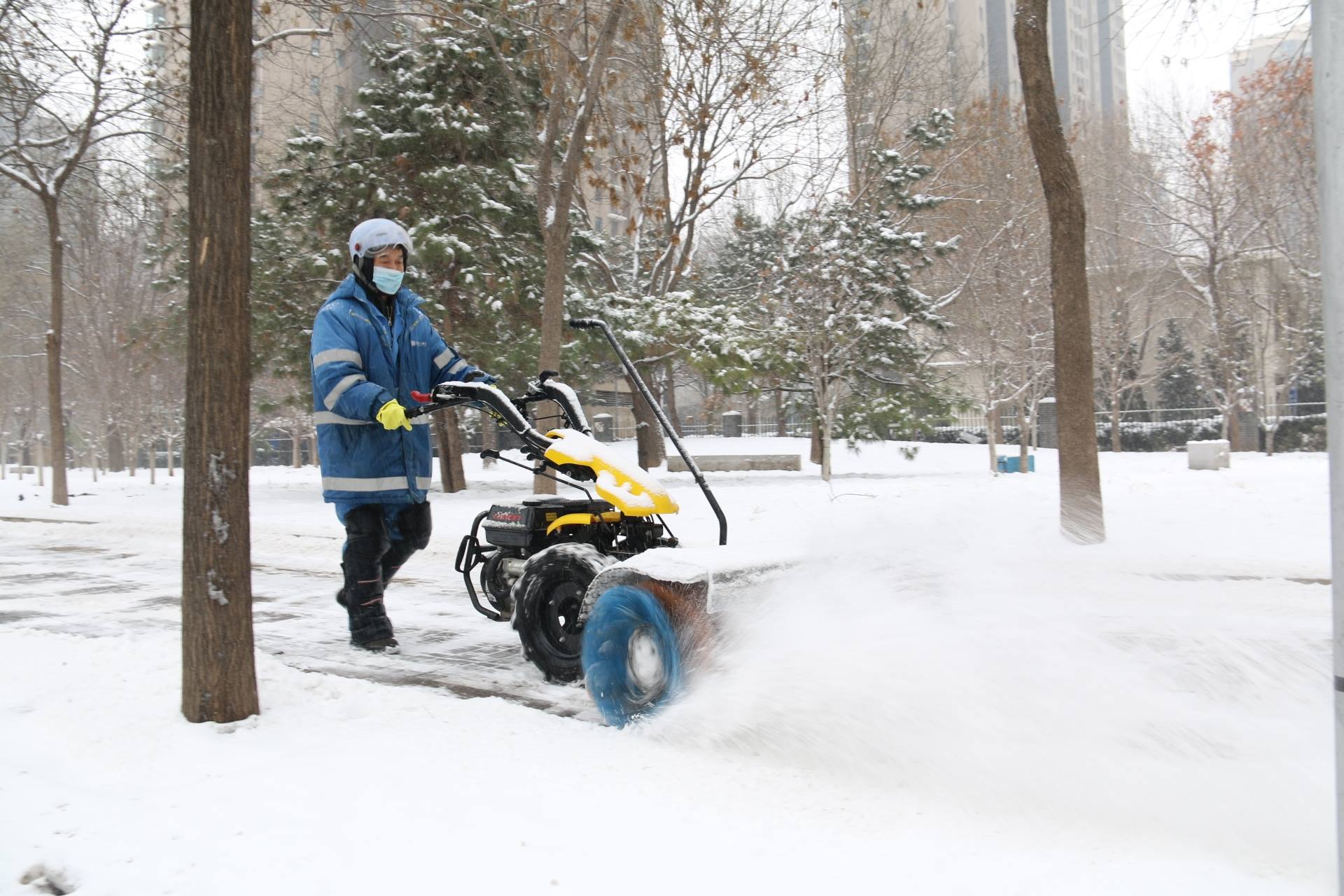 环服公司职工在朝阳区营盘沟路开展人工推雪作业(马晓洁摄)