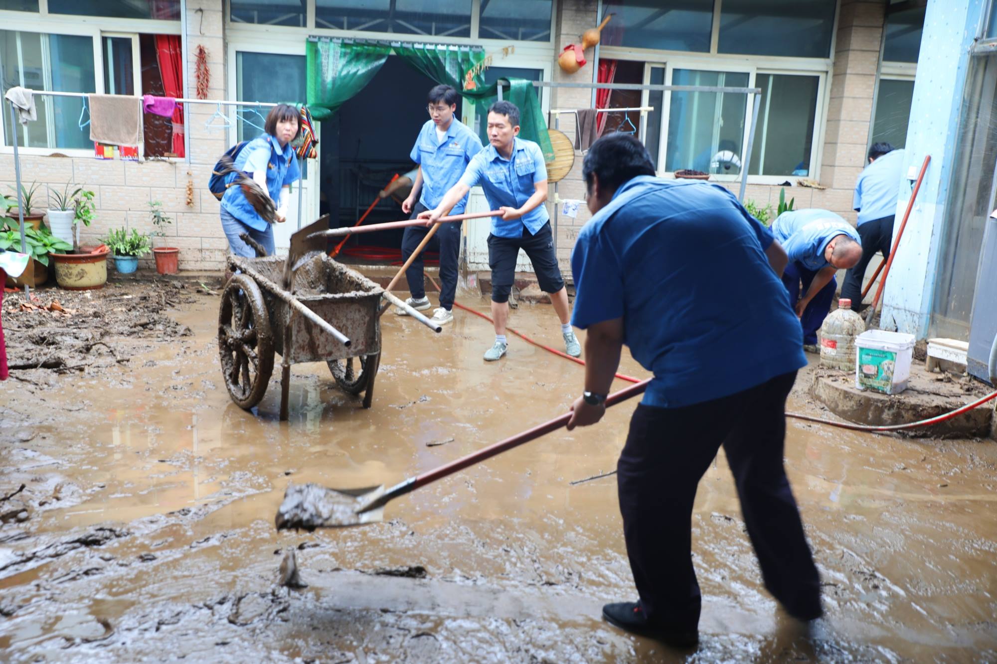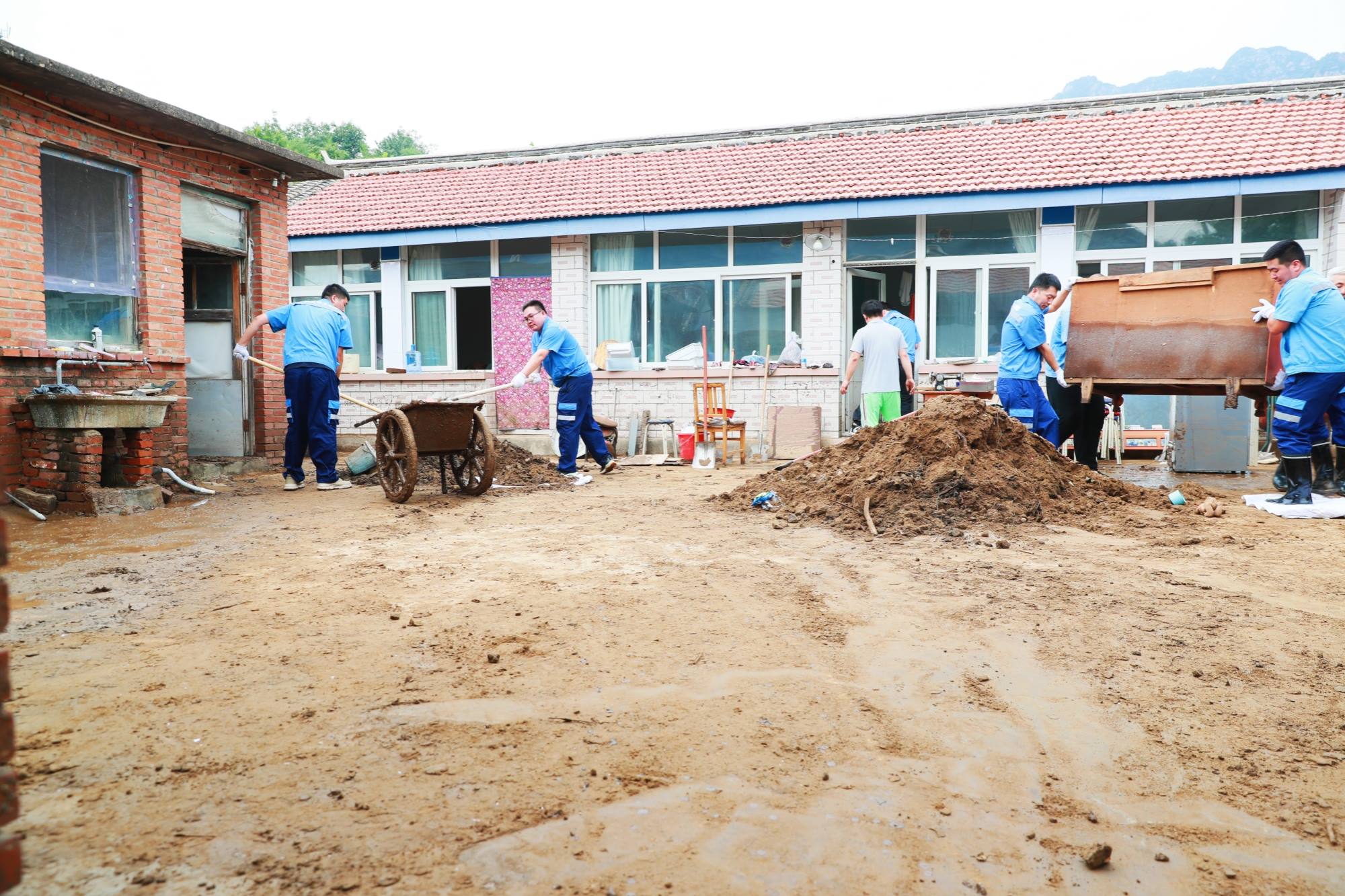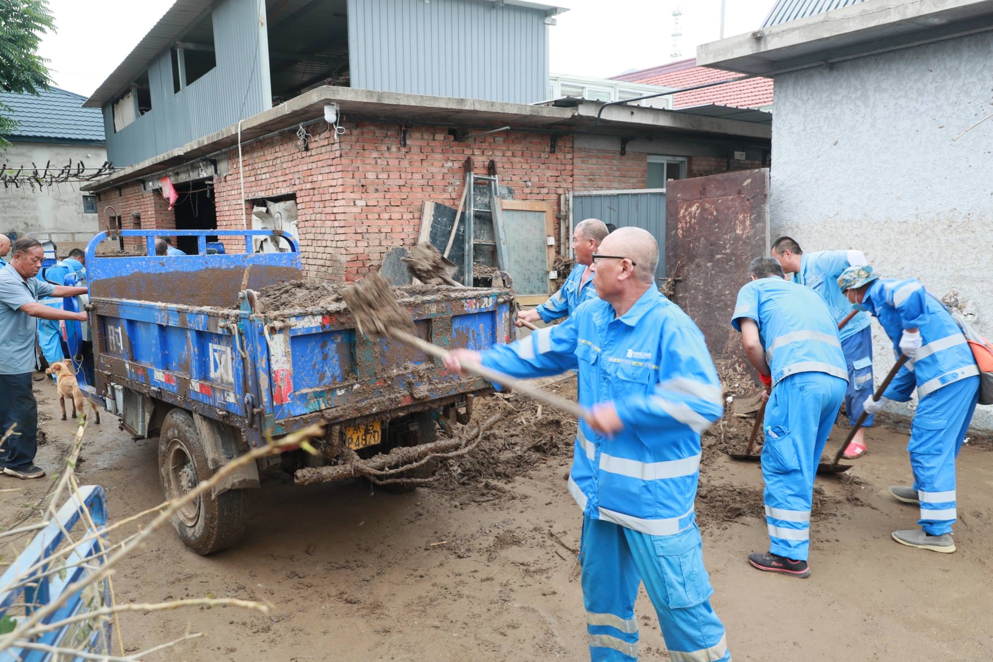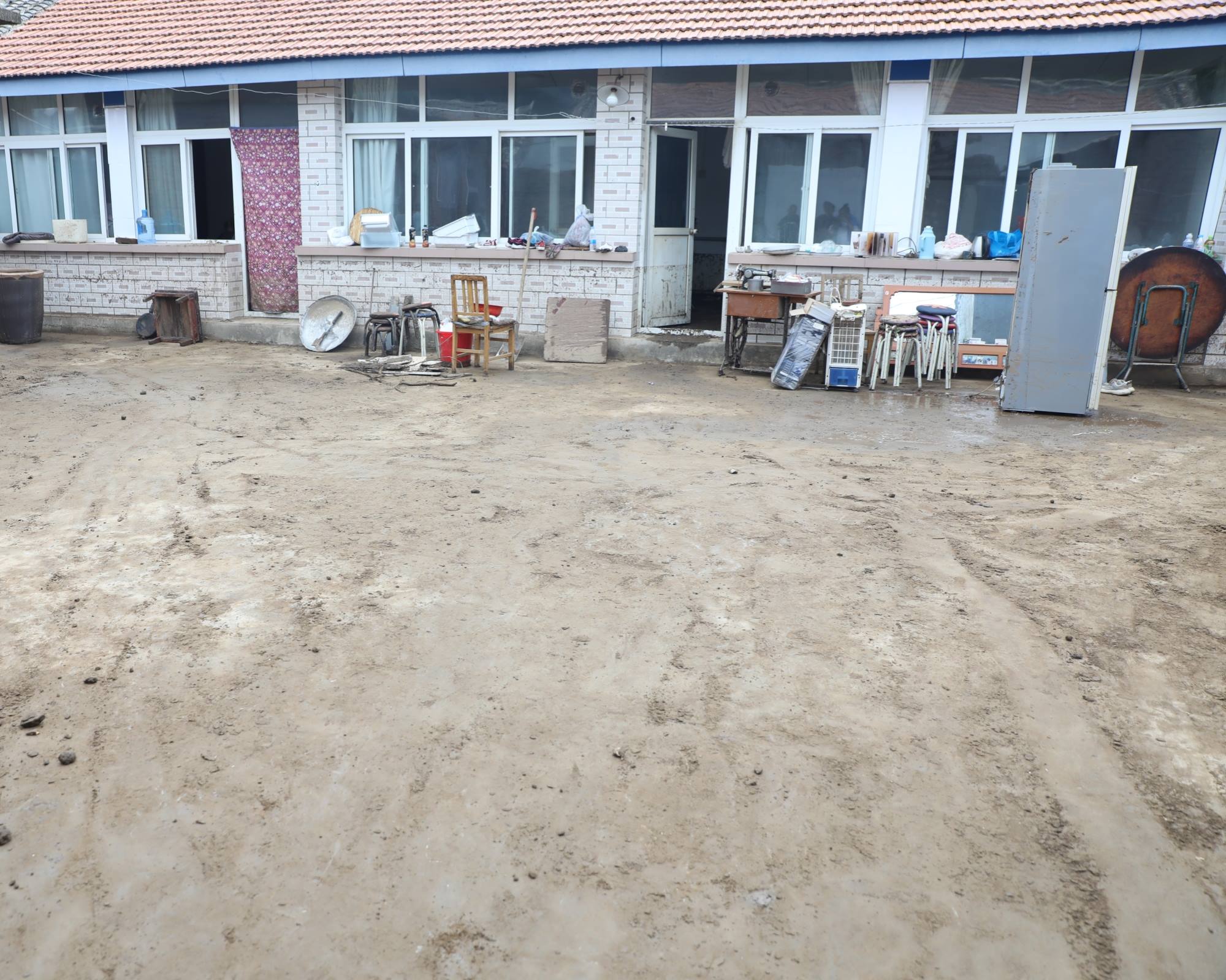 受灾后,村民院内一片狼藉,到处都是稀泥,深的地方没过小腿。折断的树枝、树叶、杂草与家中的小件家具混杂在一起,散落在各个角落。房屋之间的道路非常狭窄,大型机械无法深入,只能由队员们人工搓堆,然后铲到自卸农用车上,慢慢地运走。每清理干净一户人家,就需要2个多小时。