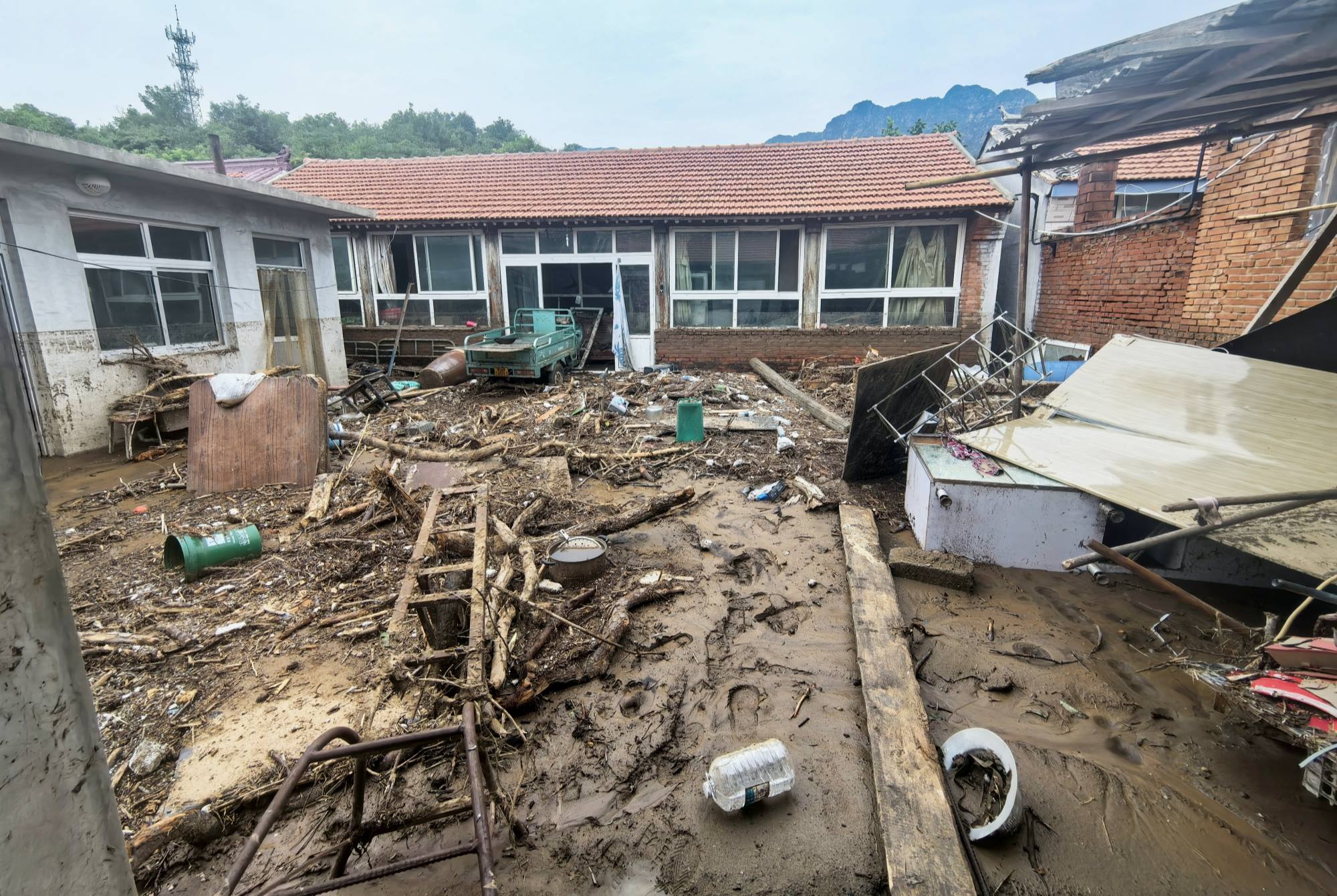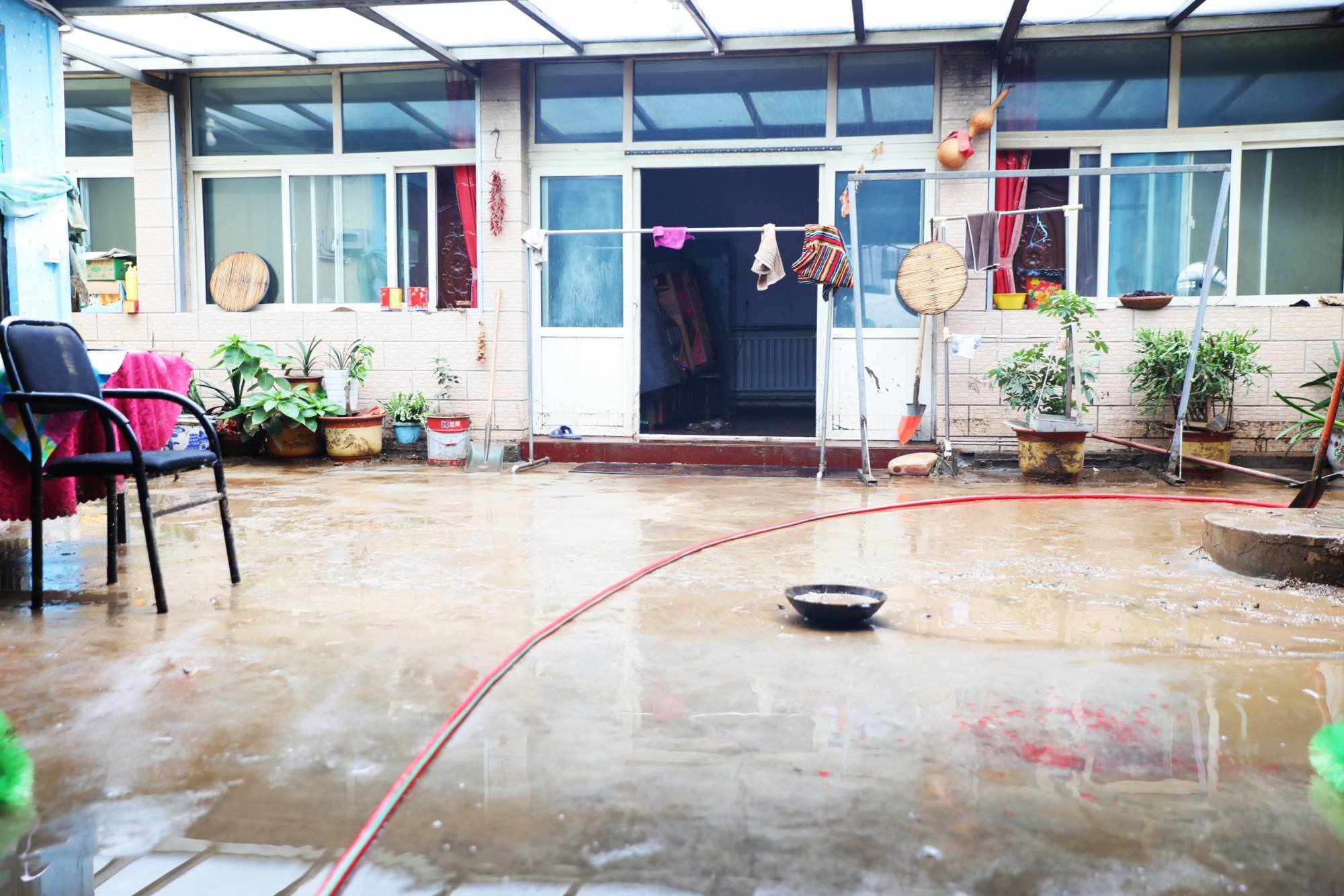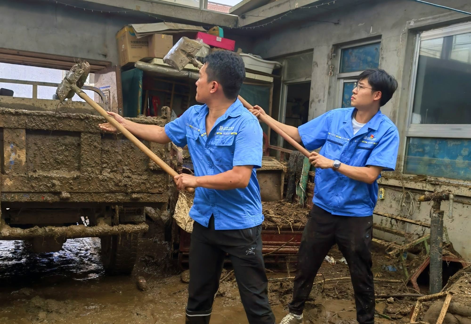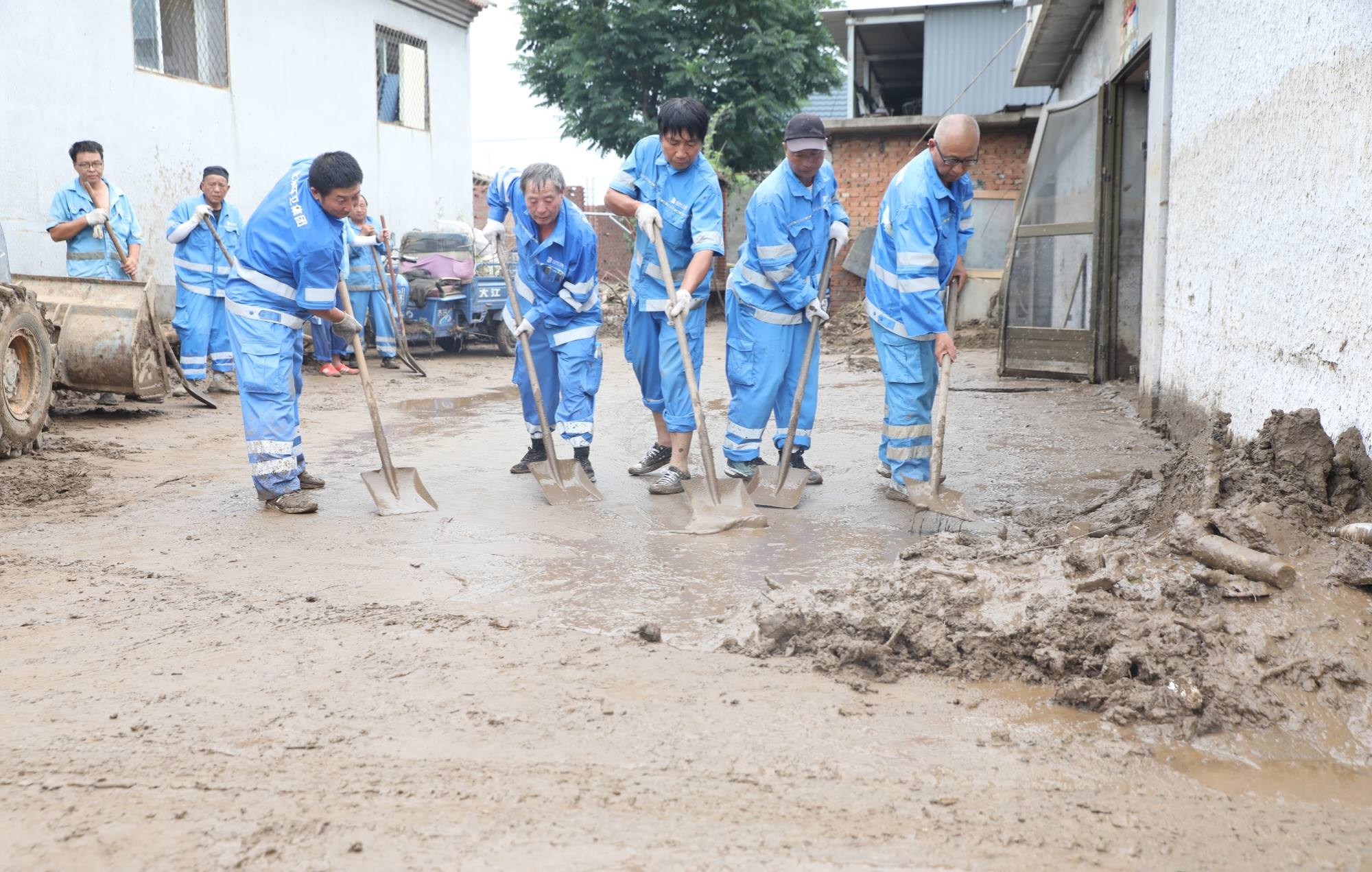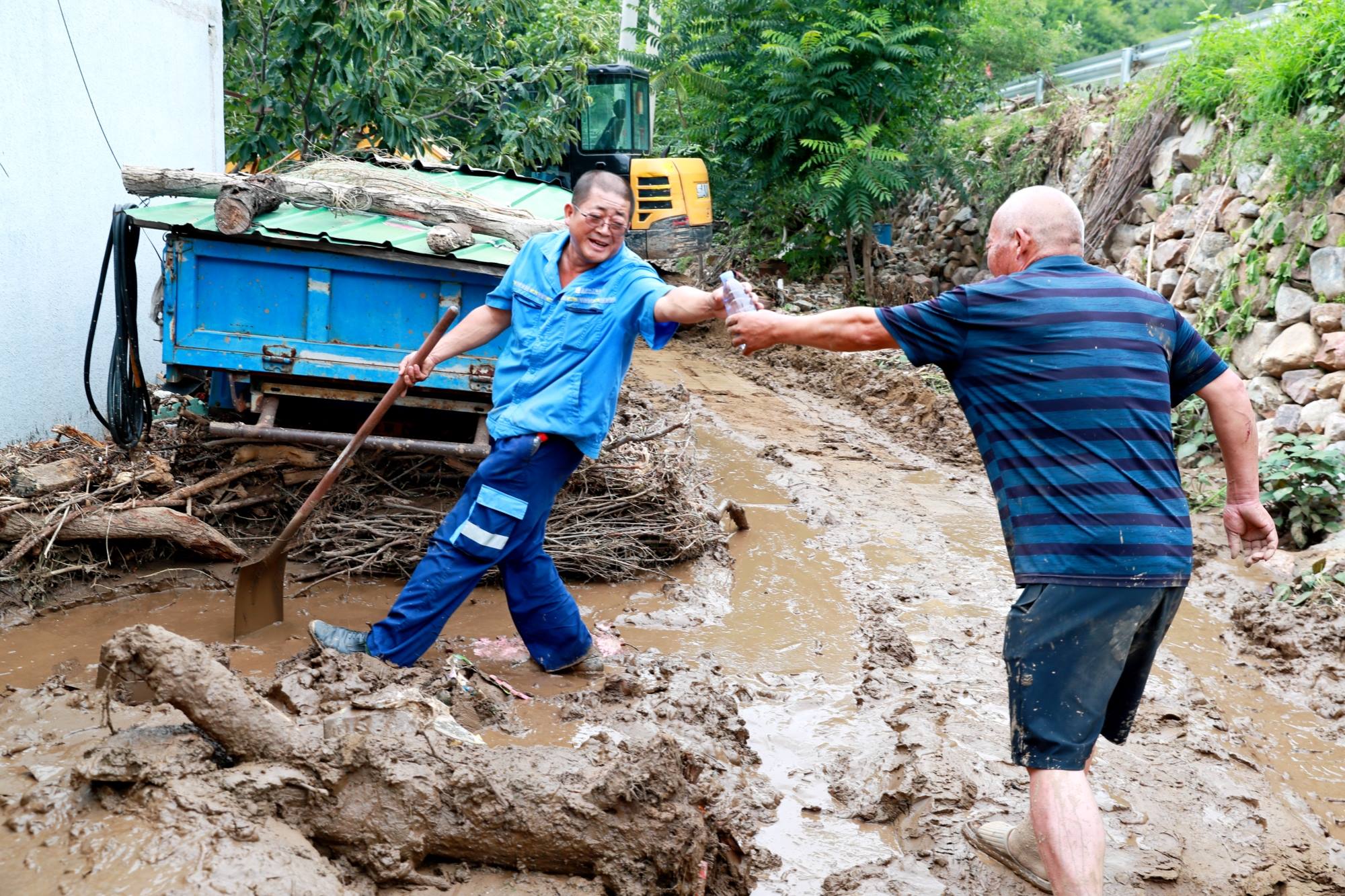 受灾后,村民院内一片狼藉,到处都是稀泥,深的地方没过小腿。折断的树枝、树叶、杂草与家中的小件家具混杂在一起,散落在各个角落。房屋之间的道路非常狭窄,大型机械无法深入,只能由队员们人工搓堆,然后铲到自卸农用车上,慢慢地运走。每清理干净一户人家,就需要2个多小时。
