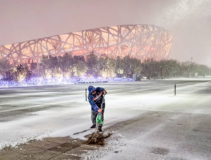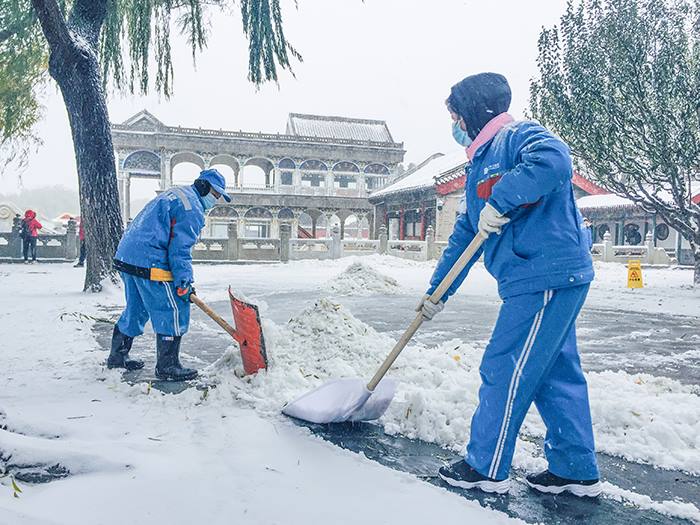 11月7日清晨7时30分许,北京机扫公司街巷服务中心职工清理颐和园景区内积雪,确保游客安全游览