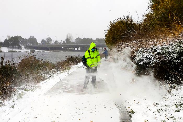 11月7日清晨8时,KY开元绿谷公司水域作业中心保洁员利用吹雪机对洳河河堤步道开展地毯式清理,以便市民欣赏冬日河景